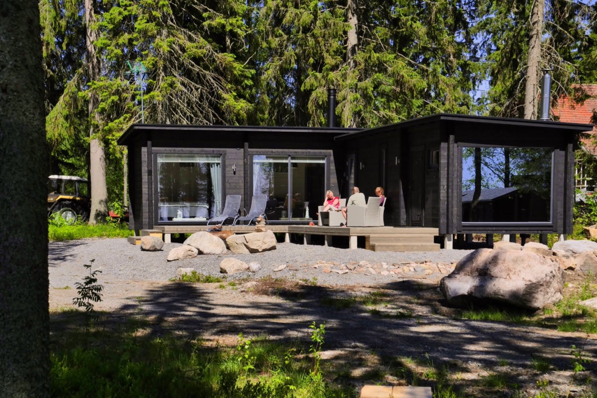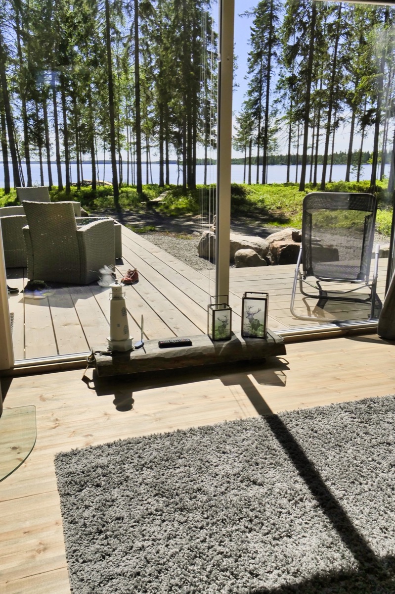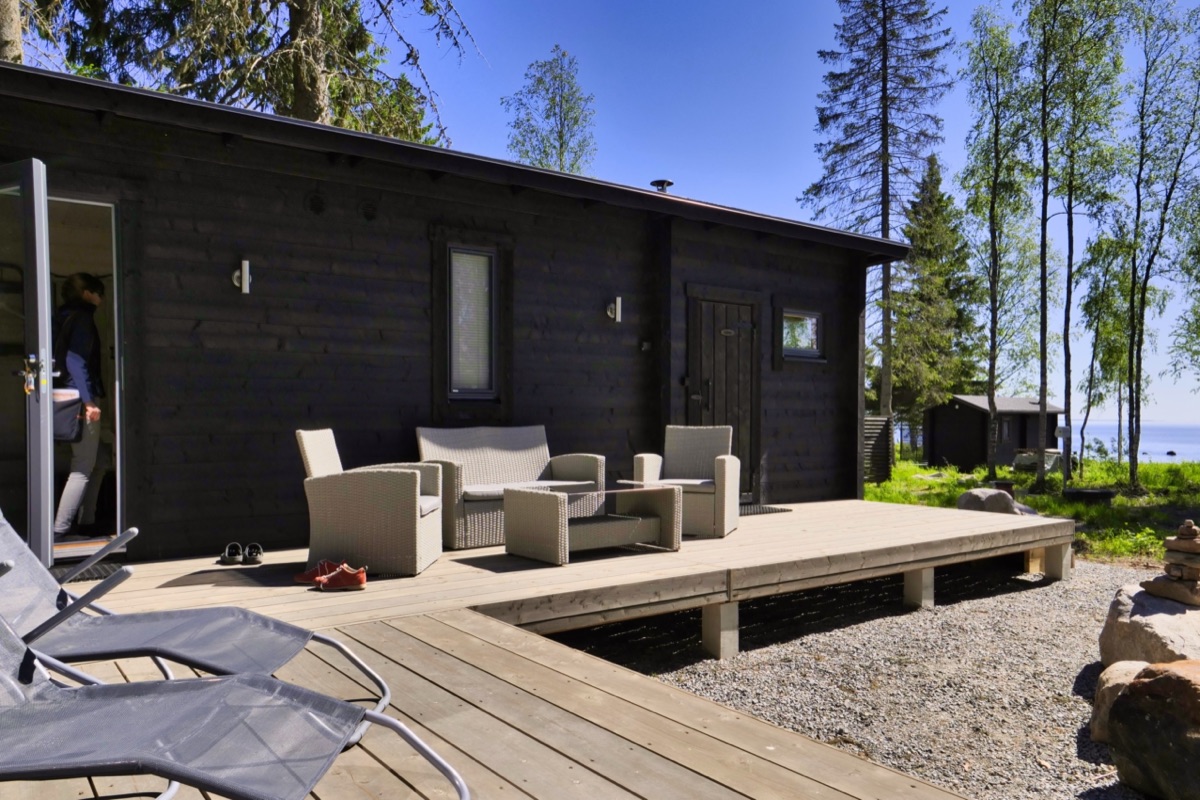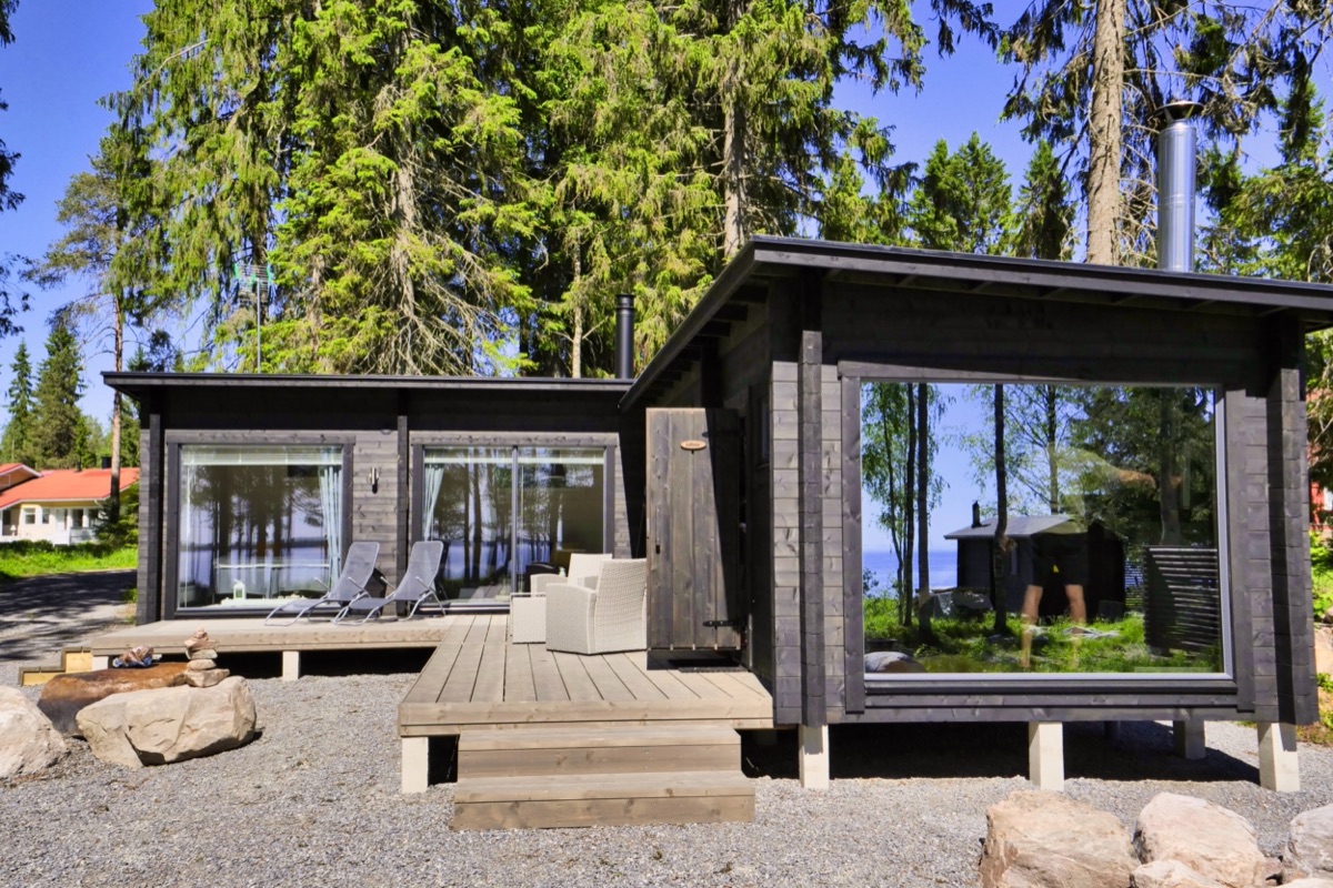 Sehr modernes Ferienhaus im Stil der Tiny-Houses. Sonnige Südlage. Von der Panorama-Sauna aus genießen Sie eine großartige Aussicht auf den riesigen Oulujärvi-See.