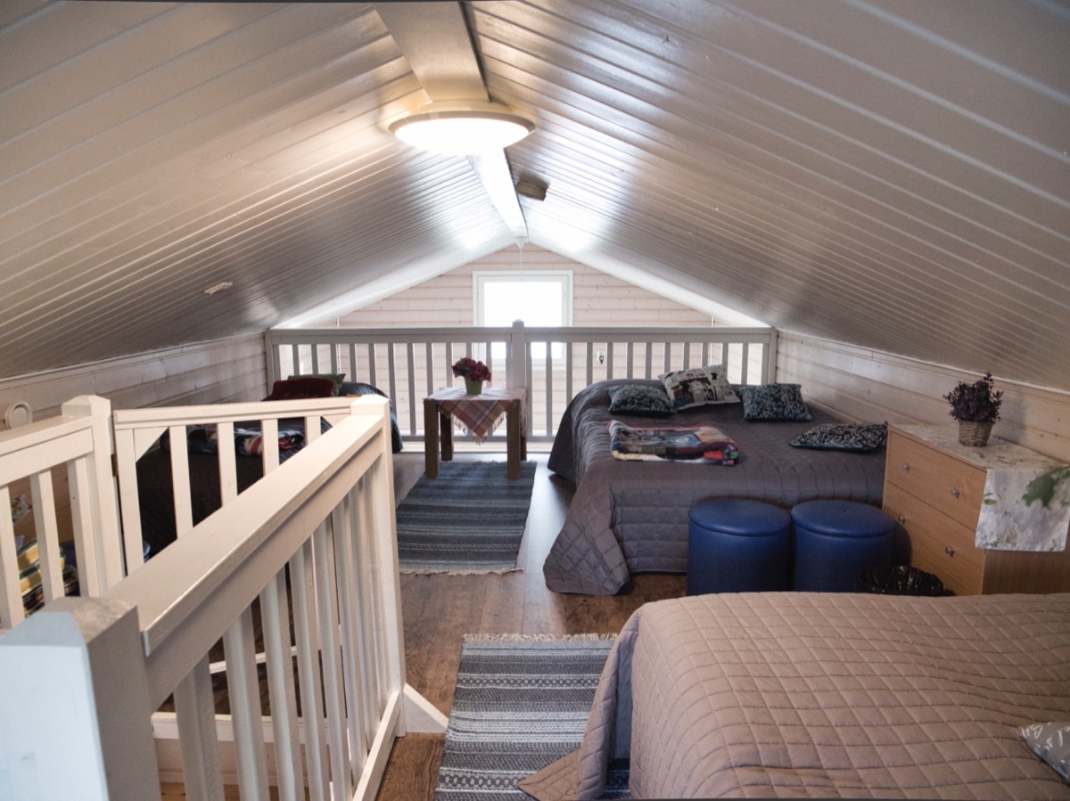 Komfortable Ausstattung. 8 Betten, davon 6 in der offenen Galerie. Elektrische Heizung, Elektroherd, 2 WCs, gratis W-Lan (Glasfaser, ca. 200Mbit/s) , Hollywoodschaukel, kleine Bibliothek mit Lesestoff für ruhige Urlaubsstunden.