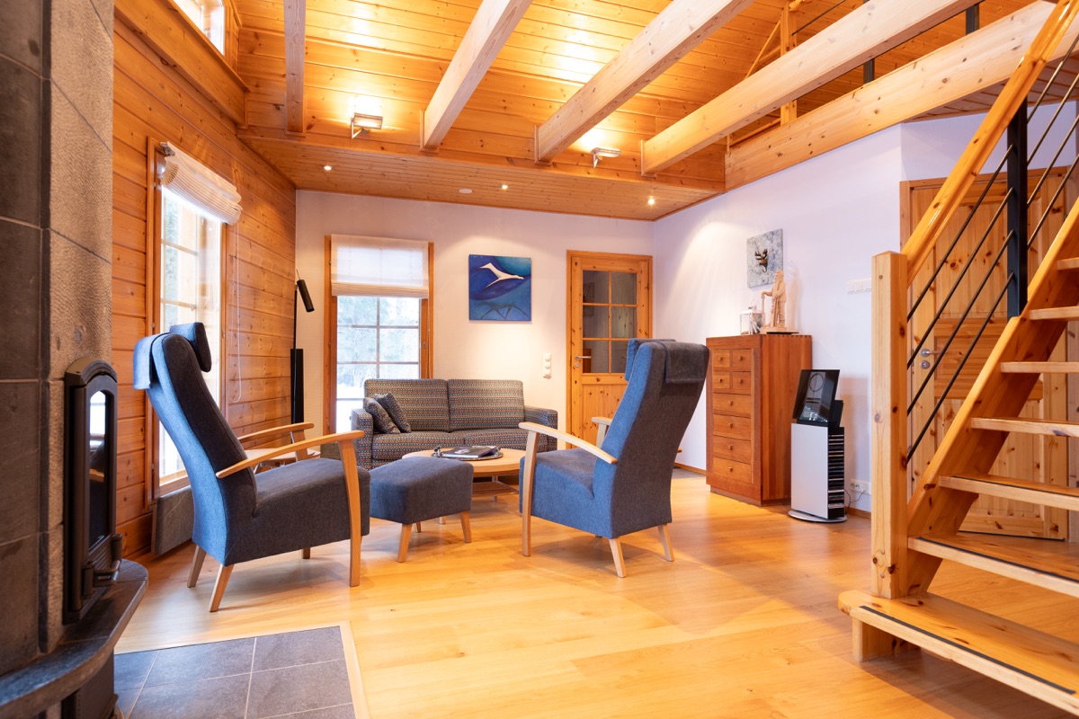 6 Betten, verteilt auf 2 Schlafzimmer mit je einem Doppelbett und ein Schlafsofa in der Schlafgalerie. Lichtdurchfluteter Wohnbereich mit gut ausgestatteter Küche. Elektrische Heizung, Whirlpool-Badewanne, Bibliothek, gratis W-Lan.