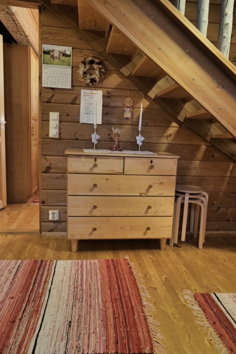 7 Betten, davon 1 Bett in der offenen Galerie und 4 Betten im Schlafzimmer des Obergeschosses. Sehr gute Ausstattung zu einem außergewöhnlich guten Preis-Leistungsverhältnis: Elektrische Heizung, Elektroherd, Brotbackofen, Mumin-Geschirr, Grillplatz (Holzgrill), Gasgrill, Kindersicherung für die Treppe. Elektrische Sauna im Haus, kleine holzbeheizte Strandsauna an der Grenze zum Nachbargrundstück. Außerdem steht ein Badezuber kostenlos zur Verfügung.
